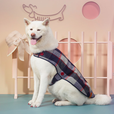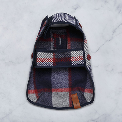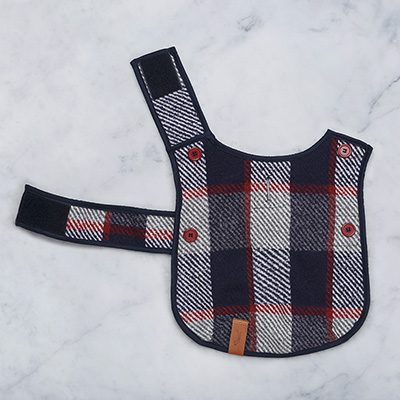 Coat made out of delicate wool. Tartan print in black/yellow or navy/red. Adorned with colour coordinated buttons on the back. Vegan Leather Label is washable. Do not iron over. Opening for harness at the back. Fastens via easy to use velcro straps, under the neck and chest. For security, velcro used is heavy duty. As a result it is advised to use with care as it may stick to the wool. To avoid this, make sure the velcro is directly above it's corresponding side.