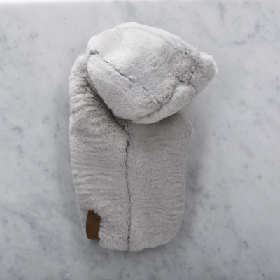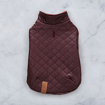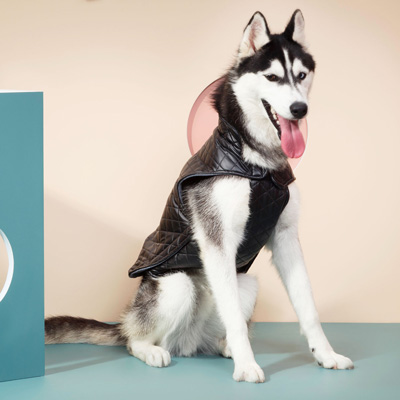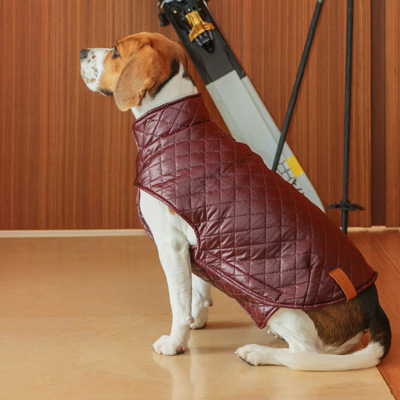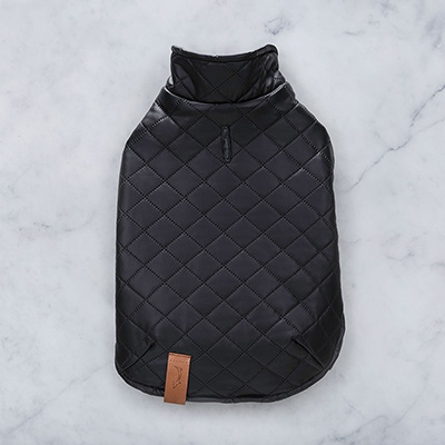 Water repellant. Sleeveless. Fastens via easy to use velcro straps, under the neck and sides. Always make sure one velcro side touches it's corresponding side. Opening for harness at the back. Vegan Leather Label is washable. Do not iron over .