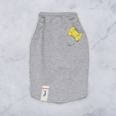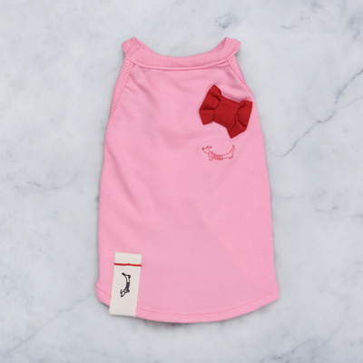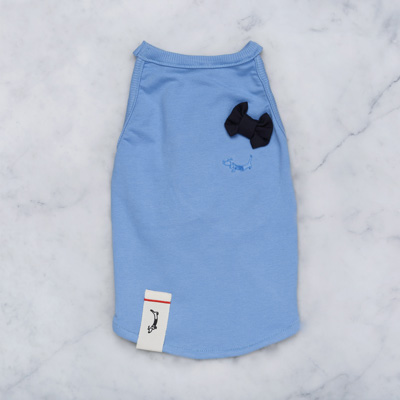 Cotton Tank Top. Embroided logo on back. (On reverse side, disolvable paper on back of logo which will disapear after 1st wash.) Bow tie. Vegan Leather Label is washable. Do not iron over.