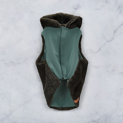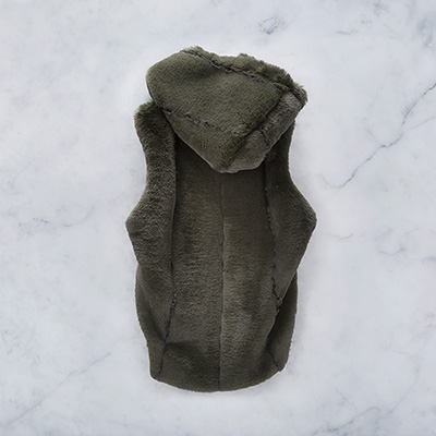 Faux fur that feels so soft. Sleeveless Gilet. Trendy hood. Vegan Leather. Label is washable.Do not iron over.